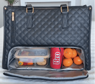 The insulated section is spacious enough to fit a full meal container, snacks, and a drink, eliminating the need for a separate cooler bag.